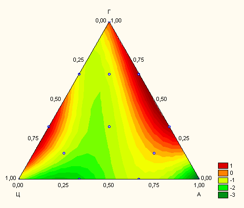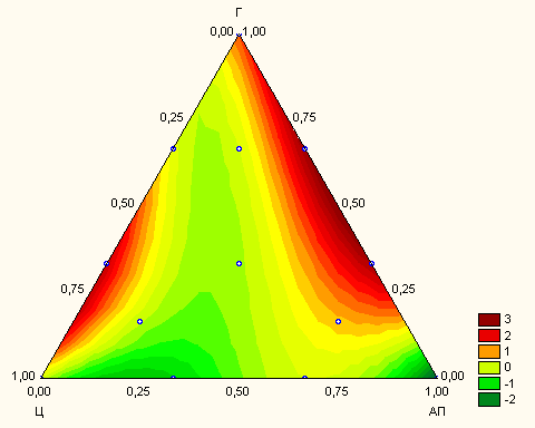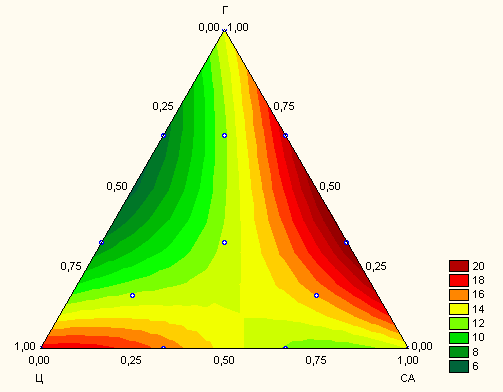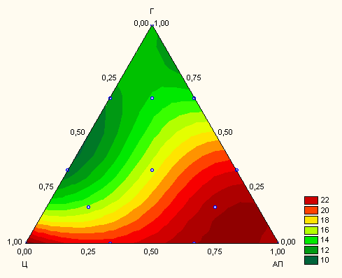 Испытания проводились с использованием симплекс-решетчатого планирования с псевдокомпонентами и обработкой результатов в системе STATISTICA 6.0 [ см. Михеенков М.А. Решение задач строительного материаловедения с использованием вычислительных систем Math Cad и STATISTICA: Учебно-методическое пособие. ГОУ ВПО УГТУ – УПИ. Екатеринбург, 2003. 85 с.] . Общий вид локальной области проведения эксперимента приведен на рис. 1.