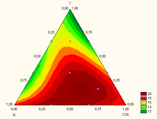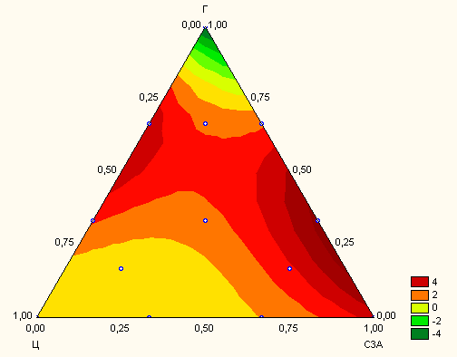 На рис. 2 и 3 показано влияние содержания в смеси высокоглиноземистого цемента и гипса на увеличение объема смеси относительно контрольного образца на чистом портландцементе и прочность образцов при сжатии. Состав смеси представлен в псевдокомпонентах.