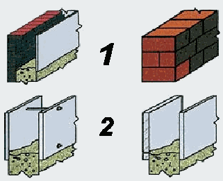 1 - укладка в несъемную опалубку (снаружи - кирпичная кладка, внутри - гипсокартон или ДВП, между ними заливается пенобетон);