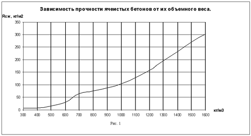 Исследования зависимости прочности марок бетона ячеистого типа от их объемного веса показали, что эта зависимость не линейна. На основании многочисленных экспериментальных данных установлено, что в интервале плотностей от 300 кг/м3 до 1200 кг/м3 графически её можно отобразить в форме сложной кривой параболического характера. На этой кривой можно выделить 4 фрагмента ограниченных следующими показателями плотности: 300 – 650, 650 – 740, 740 – 1200, 1200 - 1800 кг/см3 .