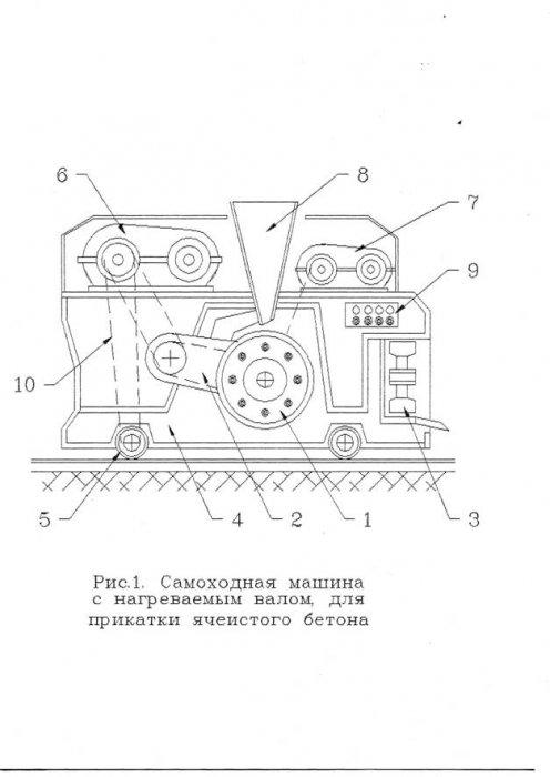 На рис. 1 показаны основные узлы машины: нагреваемый прикатывающий вал 1, поворотная каретка, поддерживающая вал 2, узел частичной (регулируемой по высоте) срезки горбушки 3, рама машины 4, ходовые колеса 5, привод хода машины и вращения вала 6, привод перемещений по вертикали вала и узла срезки горбушки 7; бункер для дисперсного материала (декоративного, гидрофобного и т. п.) при необходимости подсыпаемого на прикатываемую поверхность 8, пульт управления 9, цепная передача 10. На рисунке не показан узел принудительной подсушки поверхности и ряд других узлов.