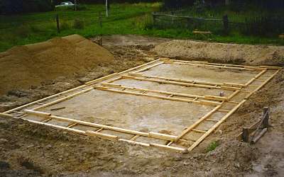 На выровненном ложе котлована из брусков сколочены "лестницы" - основа будущей опалубки. |