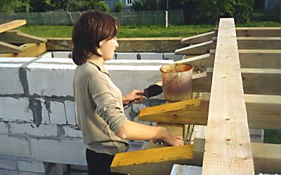 В верхнем ряду кладки этажа снова устраивается монолитный железобетонный пояс с закладными резьбовыми шпильками. Антисептированные мауэрлаты укладываются на бетон с подкладкой из двух слоёв рубероида. |