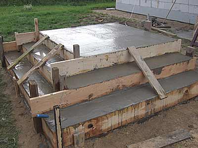 Начинаем сооружать опалубку ступеней. Ширина досок опалубки равна высоте подступенков, в нашем случае 180 мм. Доски шурупами крепятся к забитым в грунт деревянным кольям. |