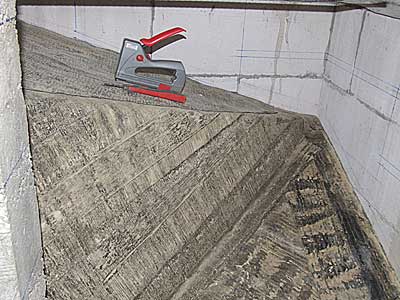 Поверхность опалубки для предотвращения ее сцепления с бетоном укрываем рубероидом, прихватывая его к доскам скобами. Рубероид в данном случае предпочтительнее полиэтиленовой пленки, т.к. он значительно прочнее, а по нему еще придется довольно много передвигаться. |