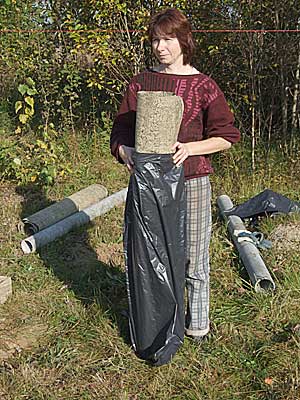 Для изоляции укладываемого бетона от грунтовой воды готовим трубку из куска рубероида, на конец которой надеваем большой полиэтиленовый мешок для мусора. |