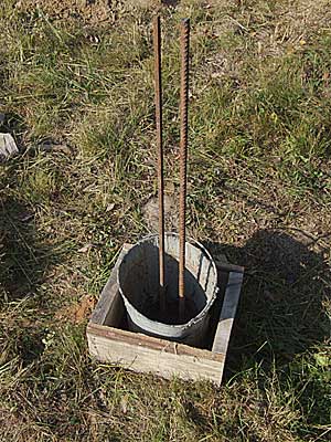 В просверленное отверстие вставляем шкворень из стального прутка и надеваем трубу на торчащую из скважины арматуру. Шкворень при этом опирается на ящик-опалубку, поддерживая трубу в подвешенном состоянии. |