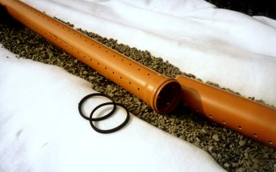 | 3 | В канавку на гравии укладываются перфорированные дренажные трубы, которые были изготовлены из ПВХ-труб для наружной укладки. Отверстия в их стенках сверлятся легко. Размер отверстий в трубах должен быть меньше размеров частиц гравия, чтобы избежать засорения. | |