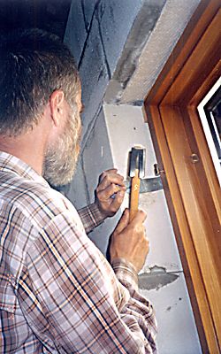 Установку оконных блоков начинаем с подготовки оконных проемов. Для надежной влагозащиты необходимо изолировать деревянные детали от каменной кладки. Решено было использовать доступные и недорогие битумные материалы. Для лучшего сцепления битума с газобетоном поверхность проема грунтуется битумной мастикой, разведенной керосином до жидкого состояния. Раствор легко наносится кистью и глубоко пропитывает основание. |