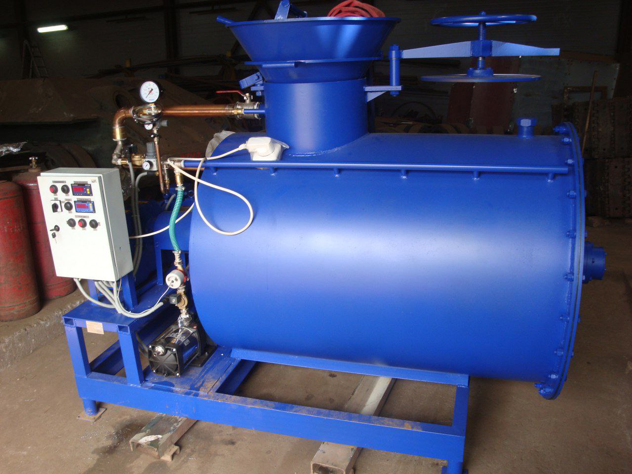 1. Загрузка компонентов: Установку наполняют водой, цементом и песком для создания цементно-песчаного раствора.
