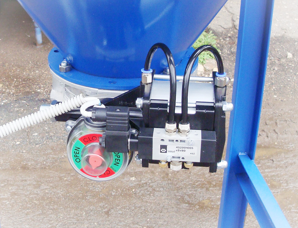 Когда достигается нужный вес дозатора, автоматика подает сигнал, автоматически открывается нижняя пневмозадвижка и весь цемент, песок, зерно или другой сыпучий материал выходят.