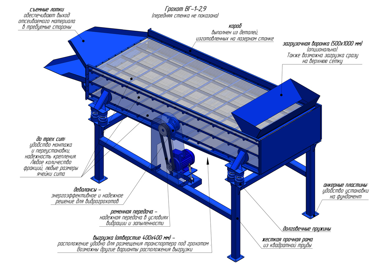 Виброгрохоты могут производится для рассева на нужное количество фракций с требуемой производительностью. Также может быть спроектирована автоподача и взвешивание компонентов.
