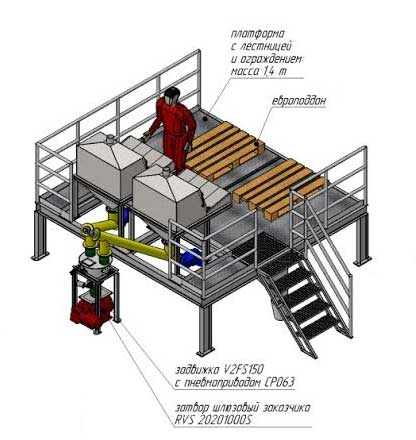Например возможна подача материала из мешков в шнек или в пневмомагистраль или дозатор с предварительным взвешиванием и учет материала.