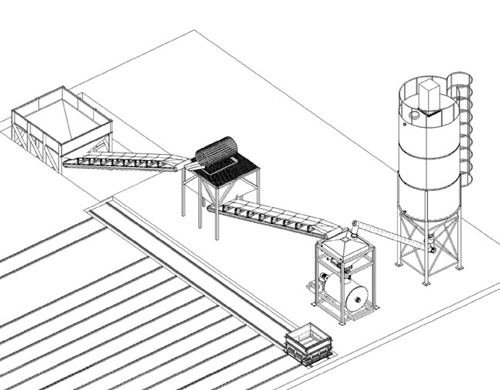 После просеивания песок попадает во второй накопительный бункер (типовой объем 4куб.м.), откуда он подается в дозирующий бункер или непосредственно в смесительное оборудование.